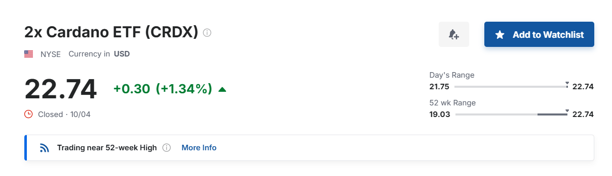 CRDD tracks Cardano futures contracts while CRDX offers 2x daily leveraged exposure. Both are now available on major brokerages including Robinhood.